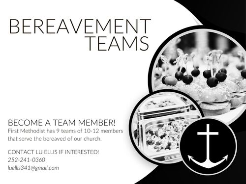 Serve the bereaved of our church. We have 9 teams of 10-12 members. Each team is usually called 1-2 times each year to provide a meal or reception for our families. We are always looking for new team members!